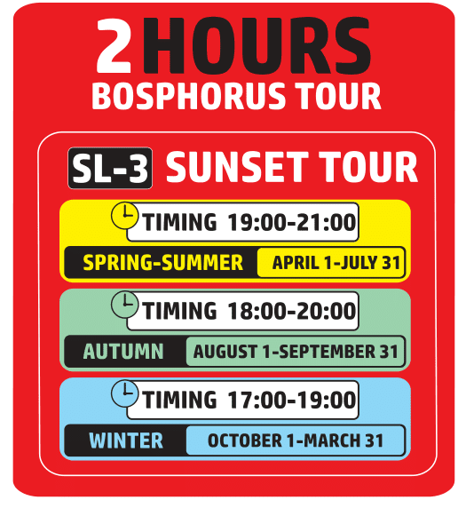 The Sunset Cruise departs daily at different times depending on the season: 7:00 PM (spring–summer), 6:00 PM (autumn), and 5:00 PM (winter).