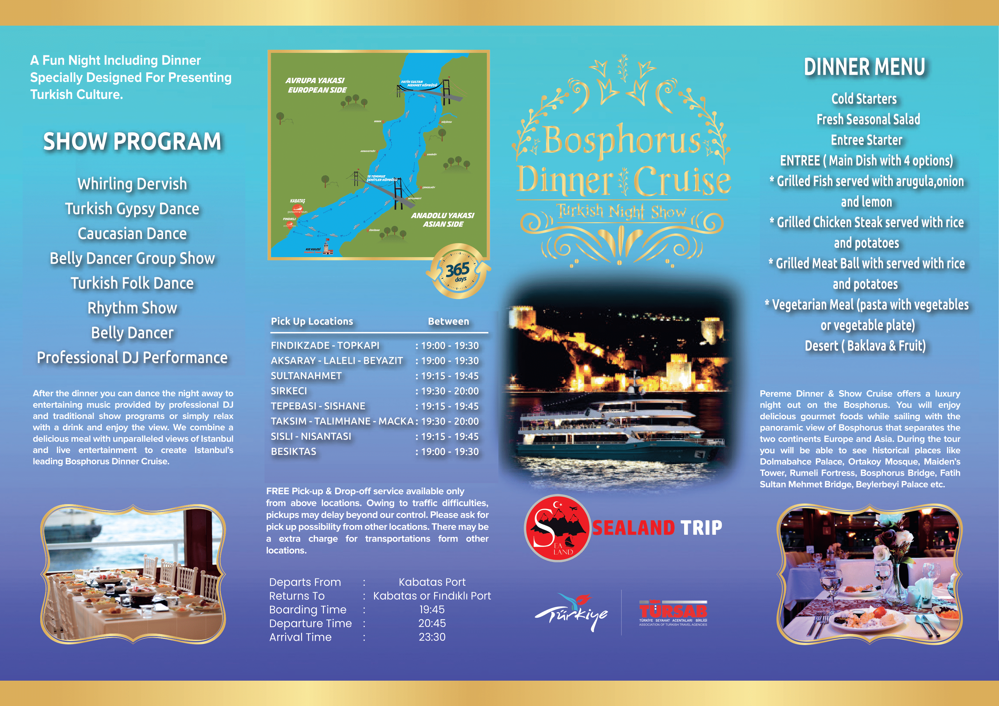 🍽️ Enjoy a delicious Turkish dinner with traditional meze, fresh salad, grilled mains (fish, chicken, or meat), and seasonal desserts 🍮🥗🥂