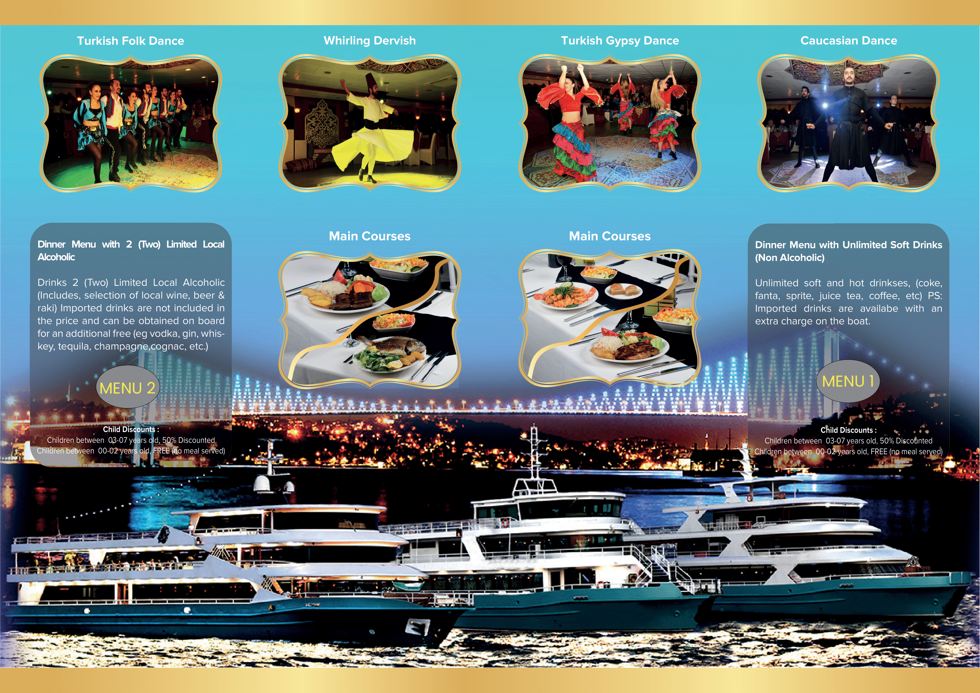 Looking for an unforgettable Istanbul night? 🌙✨ Step aboard our Dinner Cruise with Entertainment and let the rhythm of the city sweep you away.